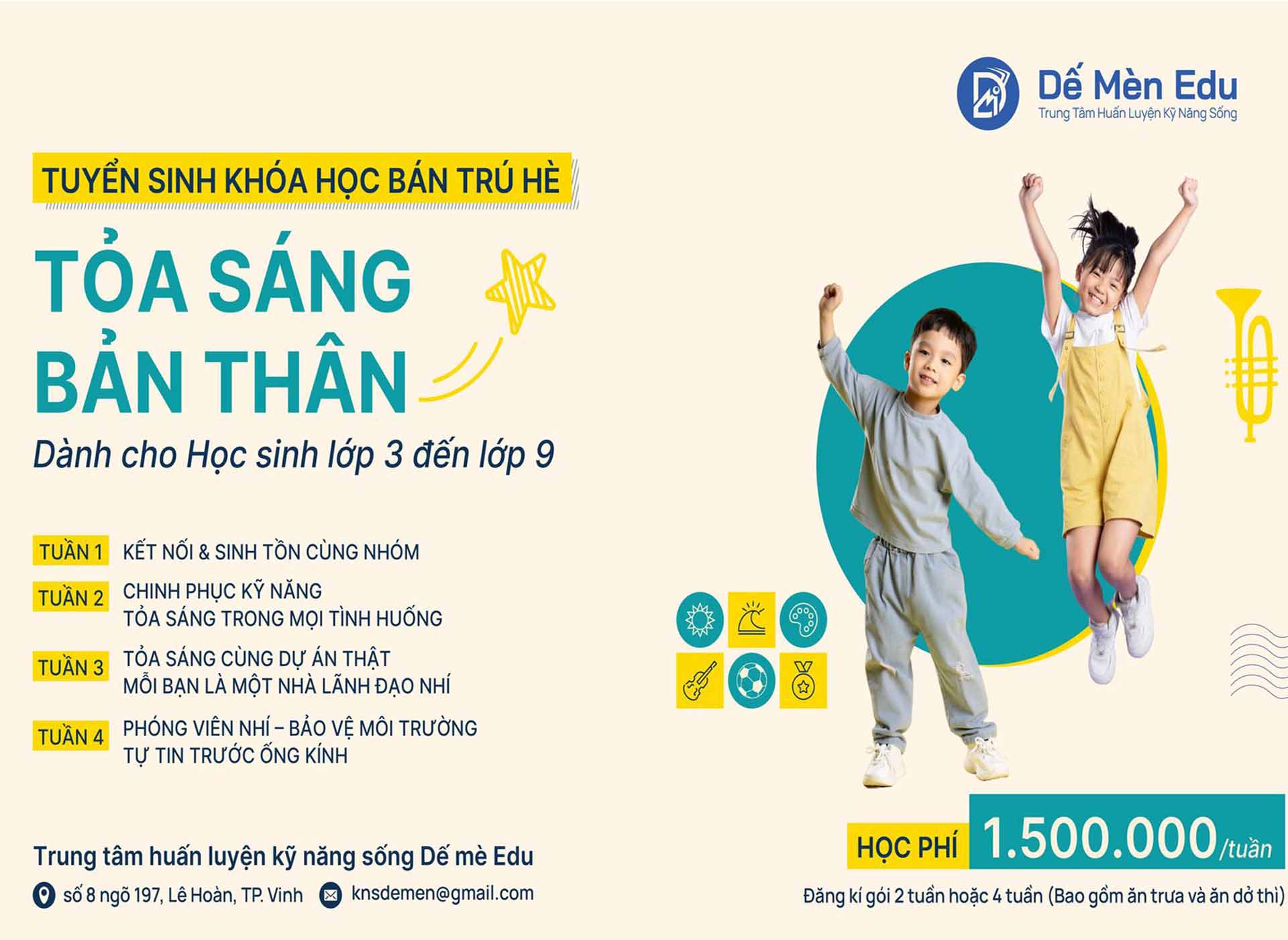 Đây là chương trình đặc biệt dành cho trẻ từ 8 –15 tuổi, kết hợp giữa học kỹ năng sống, rèn luyện thói quen tự lập và trải nghiệm môi trường sinh hoạt bán trú an toàn – kỷ luật – thân thiện. Trẻ được tham gia các hoạt động thực tiễn, phát triển toàn diện cả thể chất, trí tuệ lẫn cảm xúc trong suốt kỳ nghỉ hè ý nghĩa.